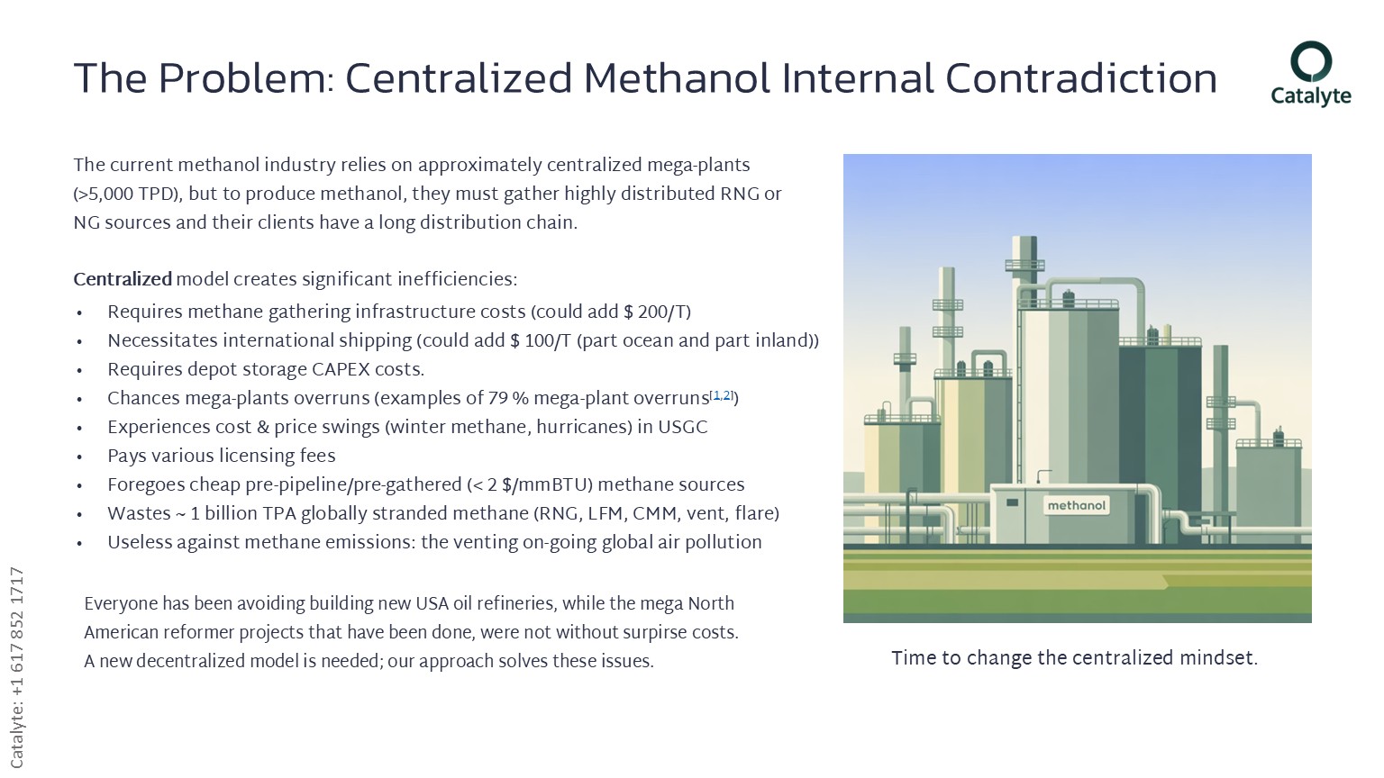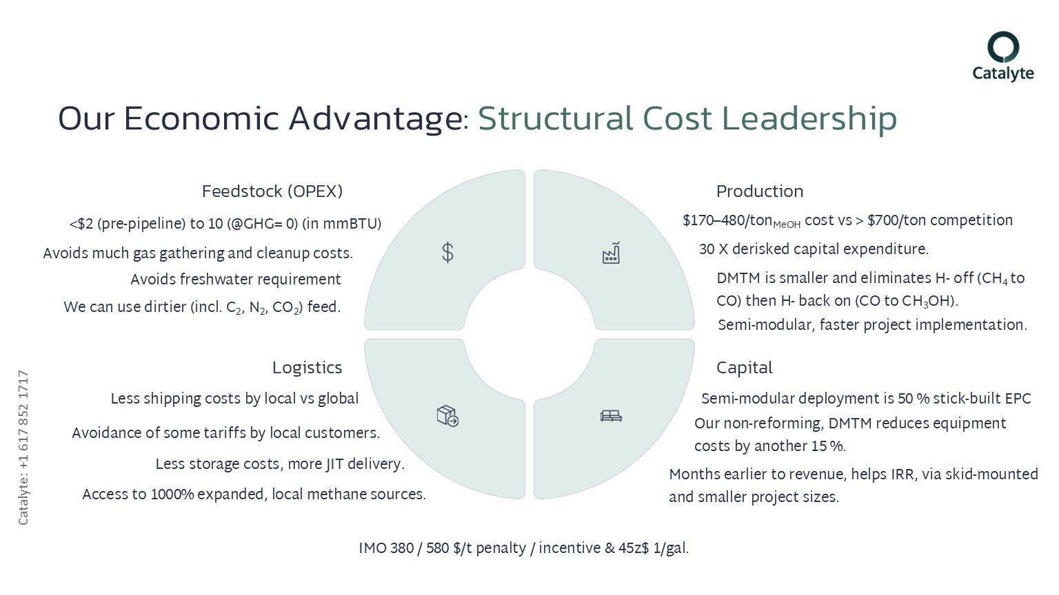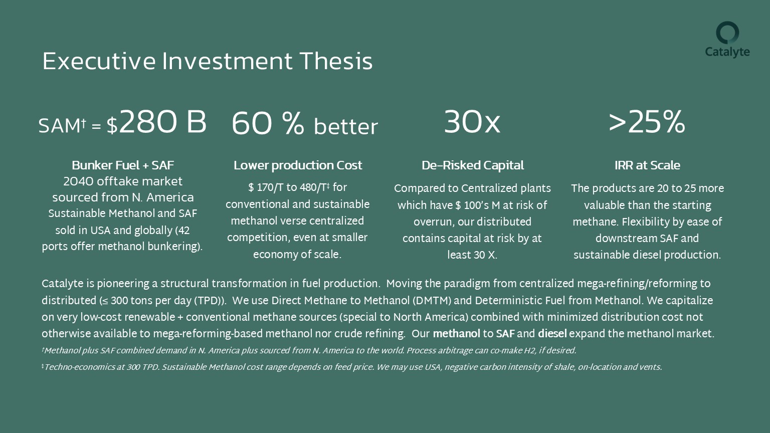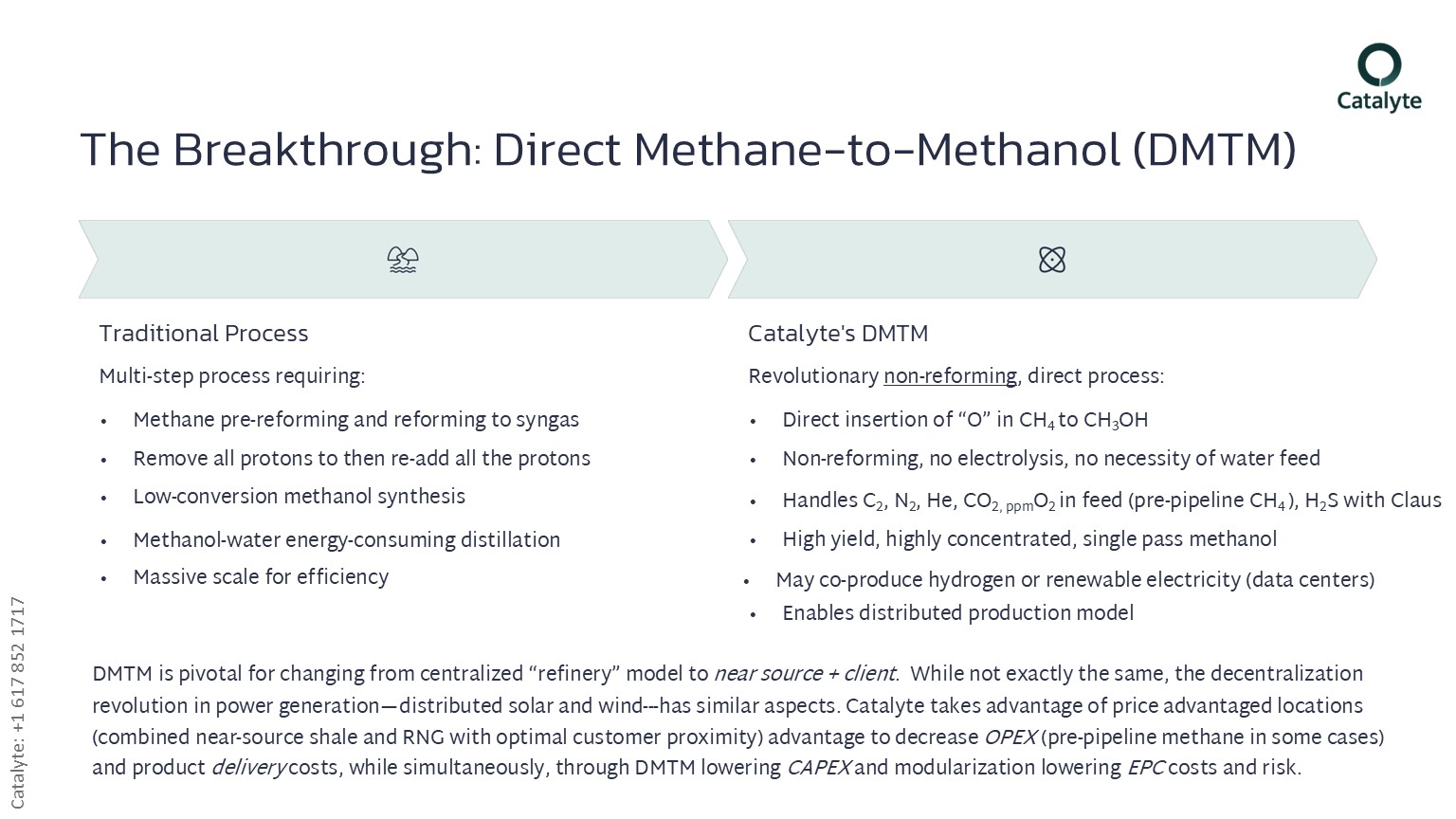 - We replace 100-year-old reforming and Fischer-Tropsch with Catalyte’s smaller footprint, no water feed, dirtier gas feed capable new process and reactor.